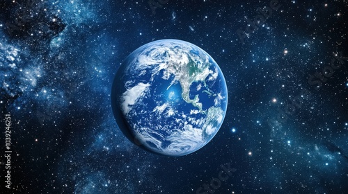 A cinematic image of planet Earth from space, with swirling white clouds and a glowing atmosphere, set against the infinite darkness of space,