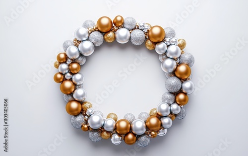 A circle made of alternating gold and silver baubles, creating a modern wreath design on white