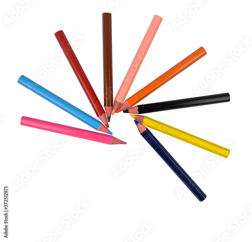 A circle pattern made with many different colored wood pencil crayons on white