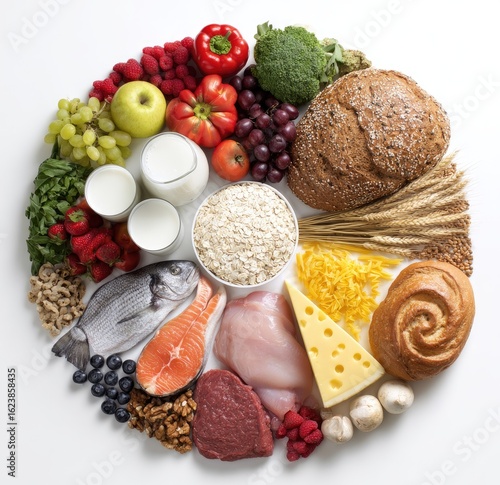 A circular arrangement of diverse healthy foods, including fruits, vegetables, grains, dairy, protein sources (fish, poultry, meat), and nuts, presented on a white background