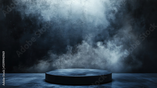 A circular platform is highlighted by a soft, ethereal light, creating an enigmatic atmosphere. Fog lingers around the platform, enhancing the mood of anticipation and intrigue in the dark space.