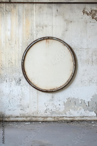 A circular signboard with a distressed metal frame, mounted on a wall with peeling paint in an abandoned alleyway