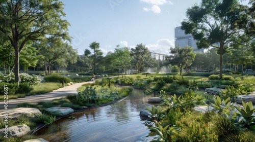 A city park with adaptive landscaping to manage stormwater and promote urban biodiversity.