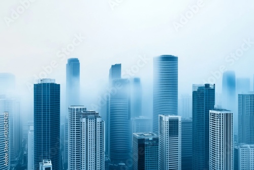 A city skyline fading into a gradient of gray smog, with only the tallest buildings visible