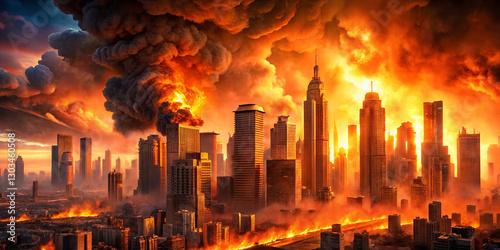 A city skyline is dominated by flames and thick black smoke rising dramatically into the sky. The destruction evokes a sense of chaos and urgency amidst the urban landscape