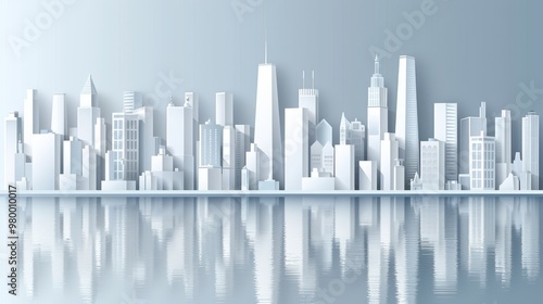 A city skyline is reflected in the water