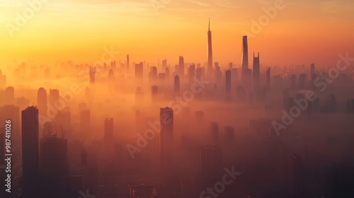 A city skyline obscured by smog, illustrating the impact of air pollution on urban life and the need for clean energy solutions