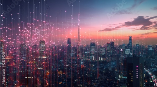 A city skyline with digital data streams representing internet connectivity and smart city technology.