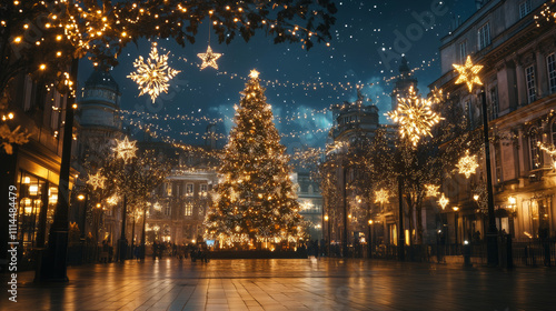 A city square, with grand light installations and sparkling decorations surrounding a towering Christmas tree.