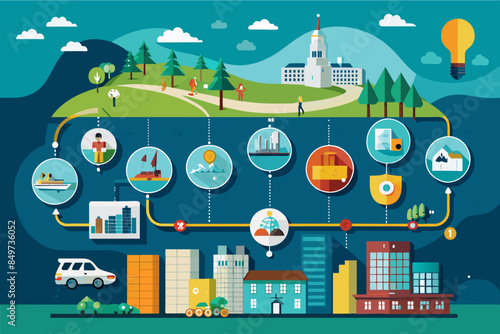 a city with a lot of different things in it, Create infographic timelines to visually represent historical events or project schedules