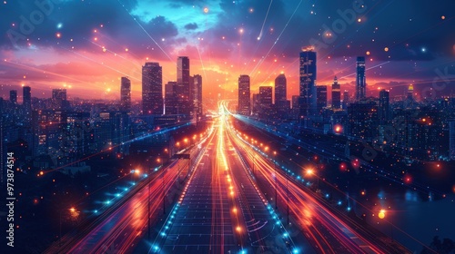 A cityscape at night with a highway illuminated by headlights and streetlights, with a vibrant sunset in the background.