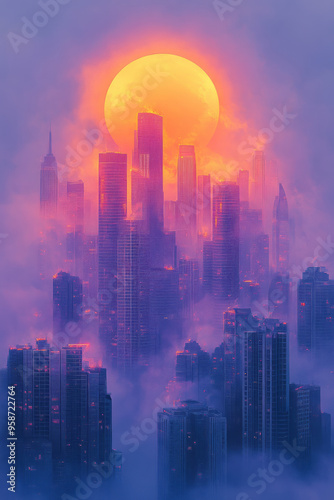 A cityscape created from overlapping circles and semi-circles in shades of pastel purple and yellow, isolated on a pastel blue background,