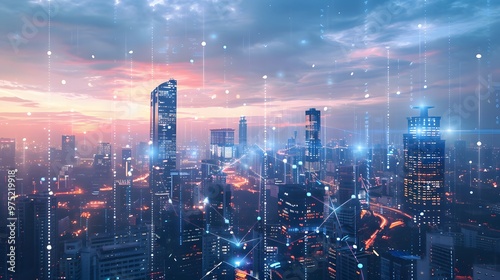 A cityscape with a cloudy sky and buildings lit up in neon colors. Scene is futuristic and vibrant