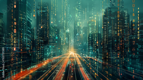 A cityscape with a lot of lights and numbers. The city is lit up and the numbers are scattered throughout the image. Scene is futuristic and modern
