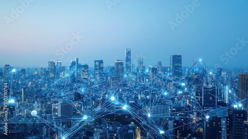 A cityscape with connected network lines and technology icons, representing the digital transformation of urban environments. The background is a clear blue sky, symbolizing hope for future