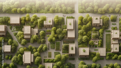 A cityscape with many small houses and a lot of trees