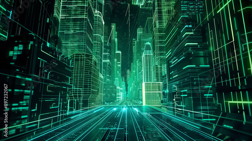 A cityscape with tall buildings and neon lights. The city is lit up and he is futuristic
