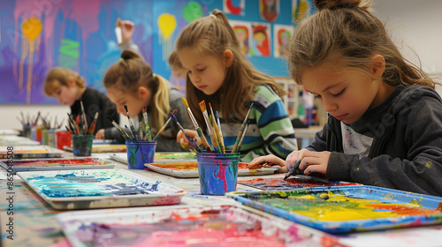 A class of young students working on an art project, with paints, brushes and colored paper laid out on the tables