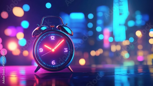 A classic alarm clock with glowing neon hands and numbers sits on a reflective surface in front of a blurry cityscape at night.