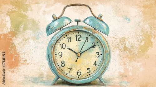 A classic alarm clock with twin bells, set against a soft pastel background.