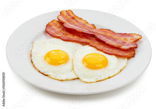 A classic breakfast of two sunny-side-up eggs with crispy golden-brown bacon strips on a white plate.