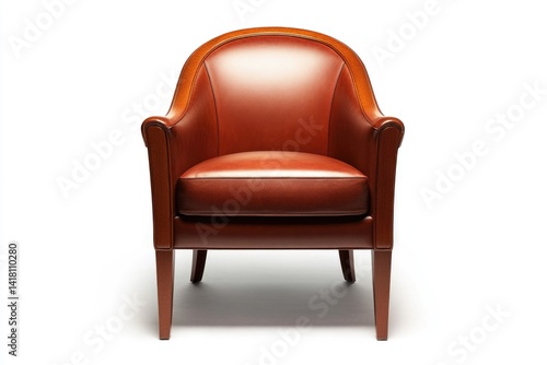 A classic brown leather armchair with wooden arms and legs, exuding elegance and comfort.