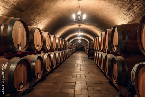 A classic dark cellar with barrels of wine or strong alcohol. Background with selective focus and copy space