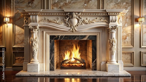 A classic fireplace with ornate detailing and a roaring fire, surrounded by intricately carved marble, creating a luxurious and inviting ambiance.