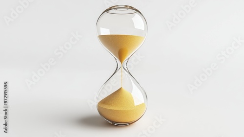 A classic hourglass with golden sand flowing through its narrow middle, set against a clean white background, highlighting its elegant curves and timekeeping function.