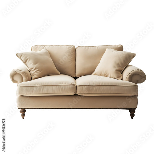 a classic Lawson-style sofa with plush cushions and a soft beige fabric, isolated on white background.