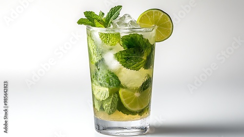 A classic Mojito cocktail in a tall glass, filled with ice cubes, mint leaves, and lime wedges, on a white background, sharp and refreshing lighting, crisp composition. --ar 16:9 --no logo