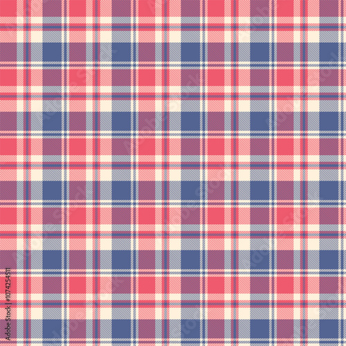 A classic plaid or tartan pattern with red, blue, and beige intersecting lines creates a grid-like design. The design has a balanced, uniform arrangement with alternating square sections.
