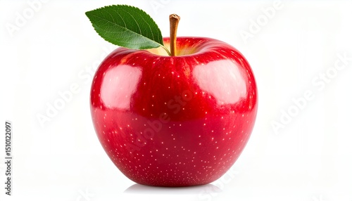 A classic shiny red apple, with a single green leaf still attached to its stem