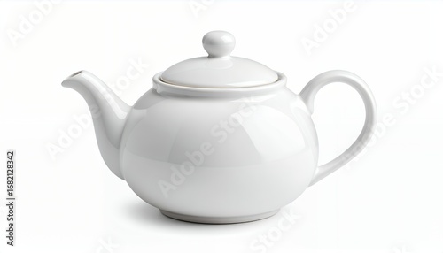 A classic white ceramic teapot with a lid, handle, and spout, isolated against a plain white background.
