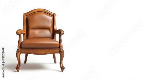 A classic wooden armchair with a rich brown leather seat, exuding elegance and vintage charm.