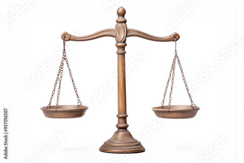 A classic wooden balance scale with intricate details, symbolizing justice and fairness, isolated on a white background