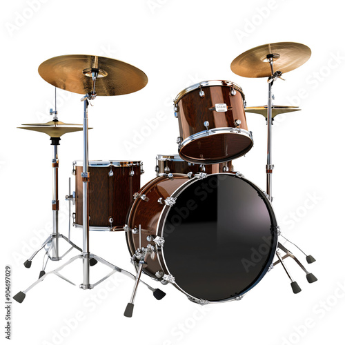 A classic wooden drum kit is arranged with cymbals and high-hats, showcasing vibrant finishes and meticulous setup in a well-lit music studio during the daytime