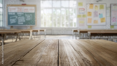A classroom interior with wooden tables, large windows, and a chalkboard.