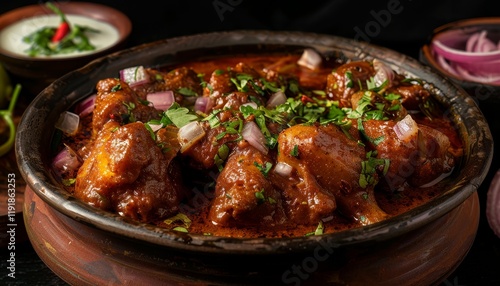 A clay bowl filled with a rich, red curry, garnished with chopped onions, cilantro, and chili peppers. The dish is served with a side of yogurt and sliced onions.
