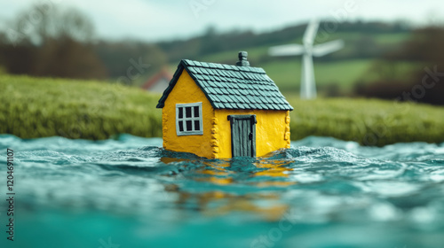 A claymation scene featuring a floating cabin with a windmill, designed for high fidelity and artistic appeal in a digital format.
