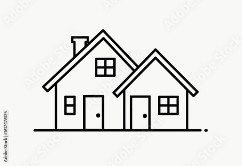 A clean and minimalist line art icon of two houses, a simple symbol for real estate, property, residential communities, and the concept of home.