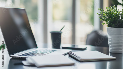 A clean desk setup featuring a notebook, pen, and smartphone, with a small plant in the background, bright natural light, uncluttered and professional