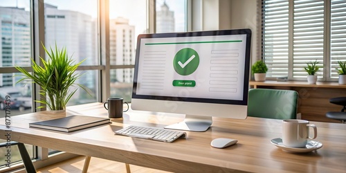 A clean desk with a monitor displaying a digital loan application, a stylus hovering over the approve button, surrounded by minimalistic office decor.
