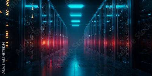 A clean, dramatic, moody shot of a single illuminated server rack/data center aisle, with glowing blue and red lights emphasizing the vastness of the digital infrastructu