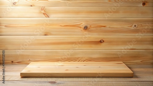 A clean, light-colored wooden platform rests gently on a rustic wooden surface, providing a minimalist and natural display setting against a backdrop of warm-toned wooden planks.