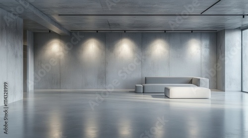 a clean, modern basement with smooth concrete walls, minimal furniture