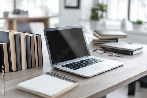 A clean, modern workspace showcases a sleek laptop next to stacked books and a notebook. Natural light enhances the organized setting, promoting productivity and focus