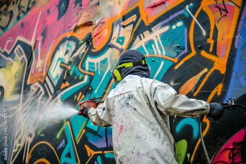 A cleaning specialist using specialized equipment to remove graffiti from walls and surfaces, Generative AI
