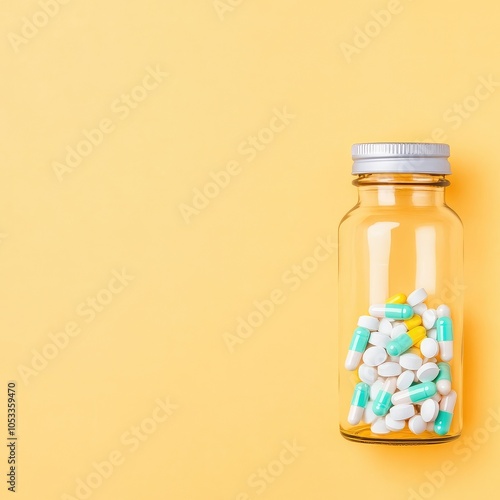 A clear glass bottle filled with colorful capsules rests against a bright yellow background, showcasing a vibrant display of medication.