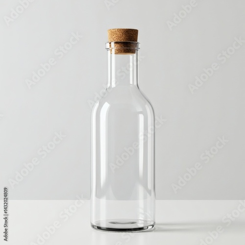 A clear glass bottle with a cork top, simple and elegant, presented on a white surface.